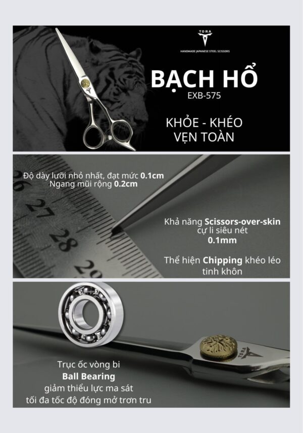 Bạch Hổ là cây kéo cao cấp nhất của TORA, hội tụ đầy đủ các yếu tố: khéo khỏe vẹn toàn. Bạch Hổ có thể sử dụng đa năng cho các kỹ thuật cắt kkhác nhau: Từ cắt các tép tóc dày, cắt outline, tinh chỉnh, hoàn thiện…