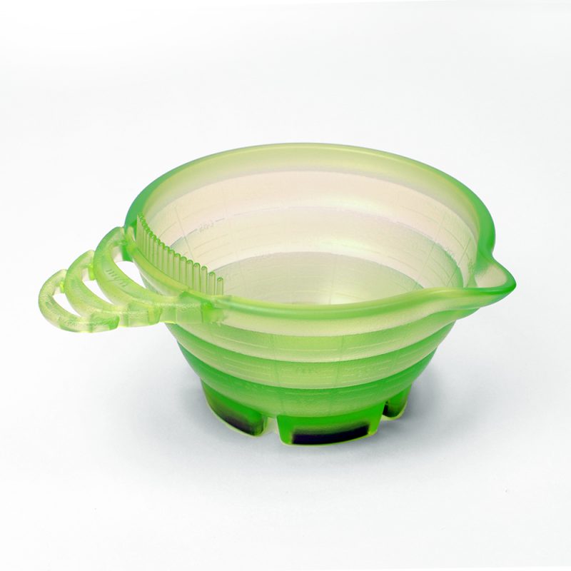 Bát nhuộm hóa chất có các răng của lược để loại bỏ chất lỏng và tóc thừa bám trên bàn chải Chất liệu được sử dụng trong ống truyền y tế, cho phép dung dịch nhuộm màu giảm các khu vực tiếp xúc với không khí ngăn chất lỏng khỏi bị oxy hóa và đảm bảo rằng màu sắc không bị ảnh hưởng bởi quá trình oxy hóa.